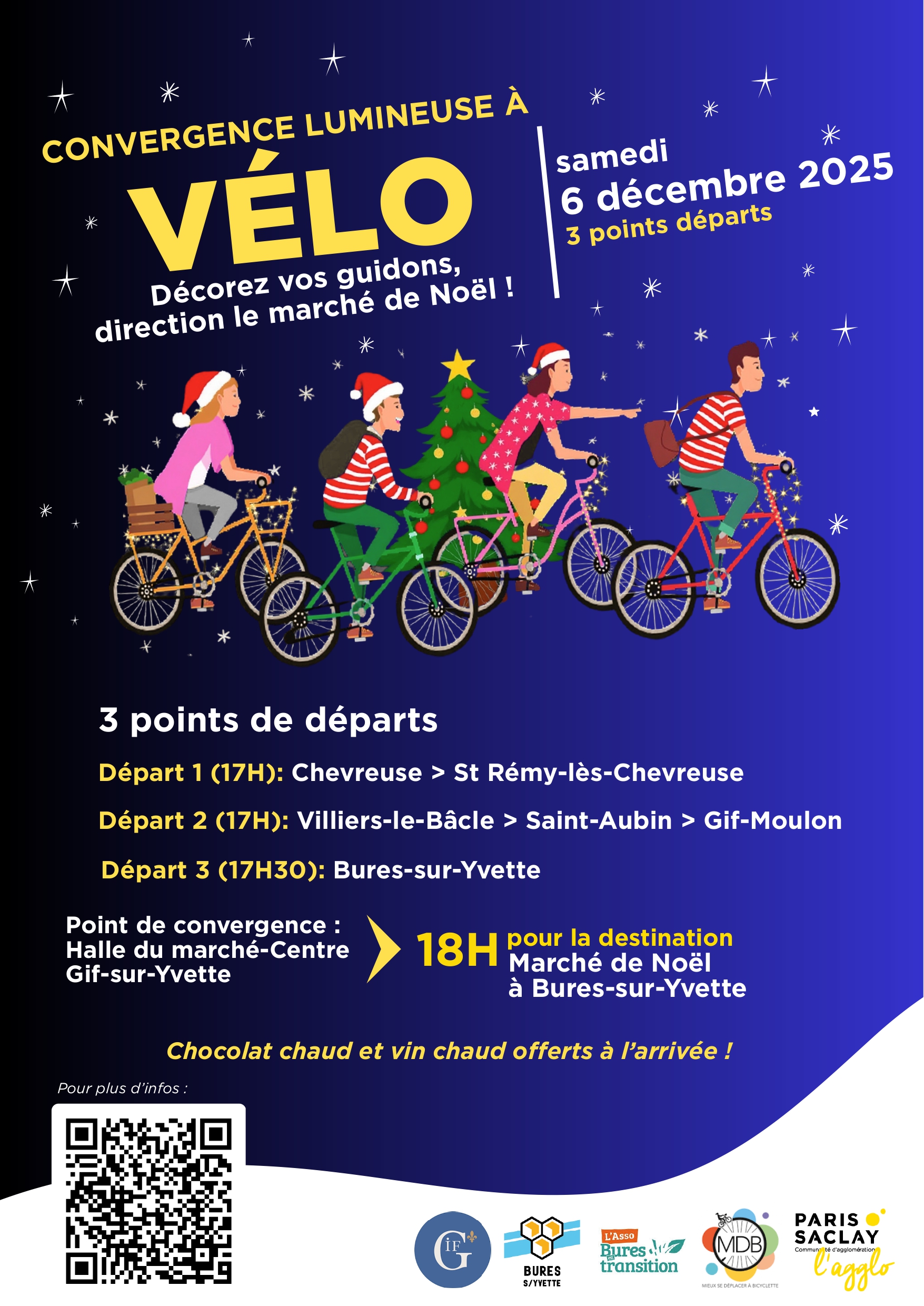 Rendez-vous le samedi 6 décembre pour une balade cycliste conviviale et festive, trois départs proposés, pour converger vers une première étape à la Halle du Marché – Centre-ville de Gif-sur-Yvette, avant de poursuivre tous ensemble vers le marché de Noël au Par de la Grande Maison à Bures-sur-Yvette.