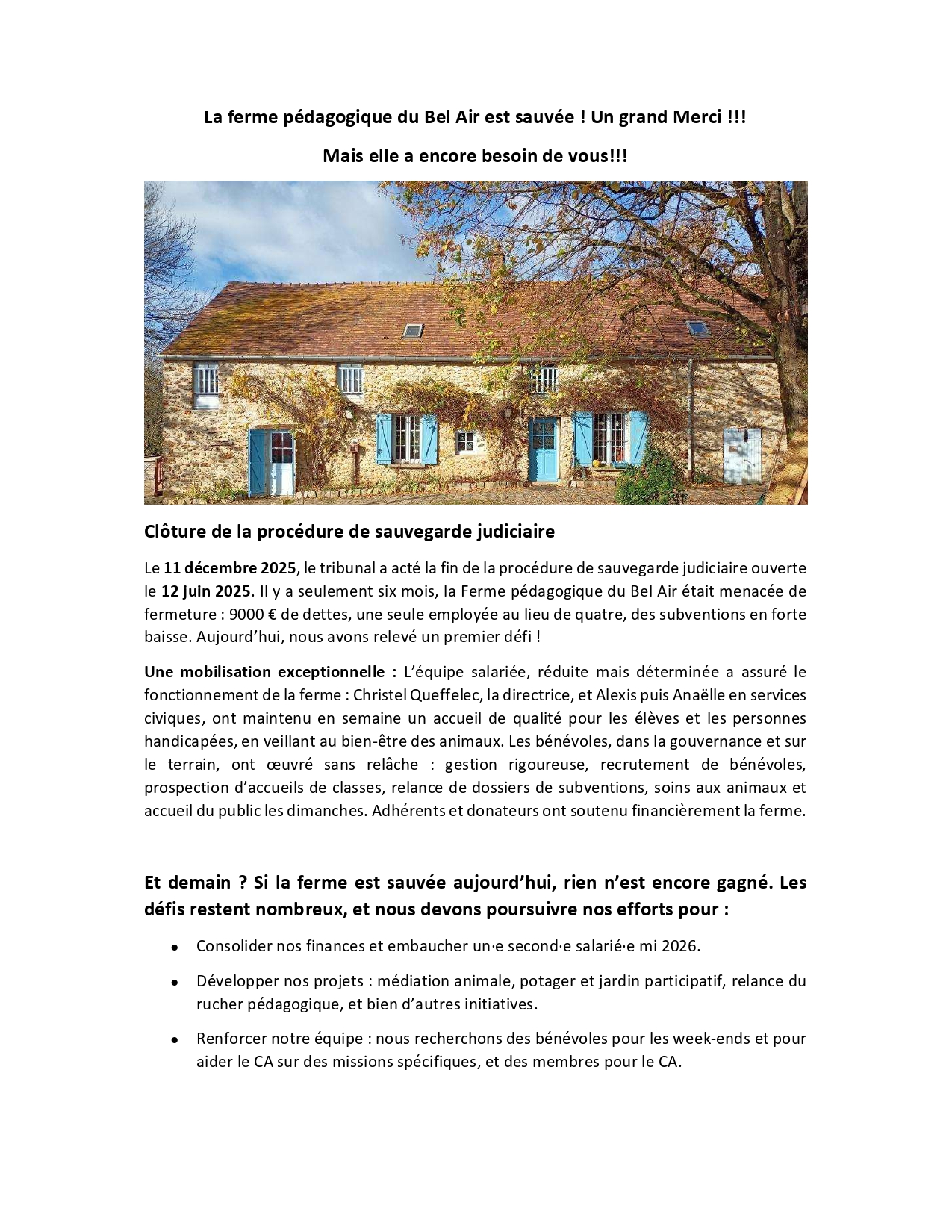 • La ferme du Bel Air est sauvée !15 janvier 2026